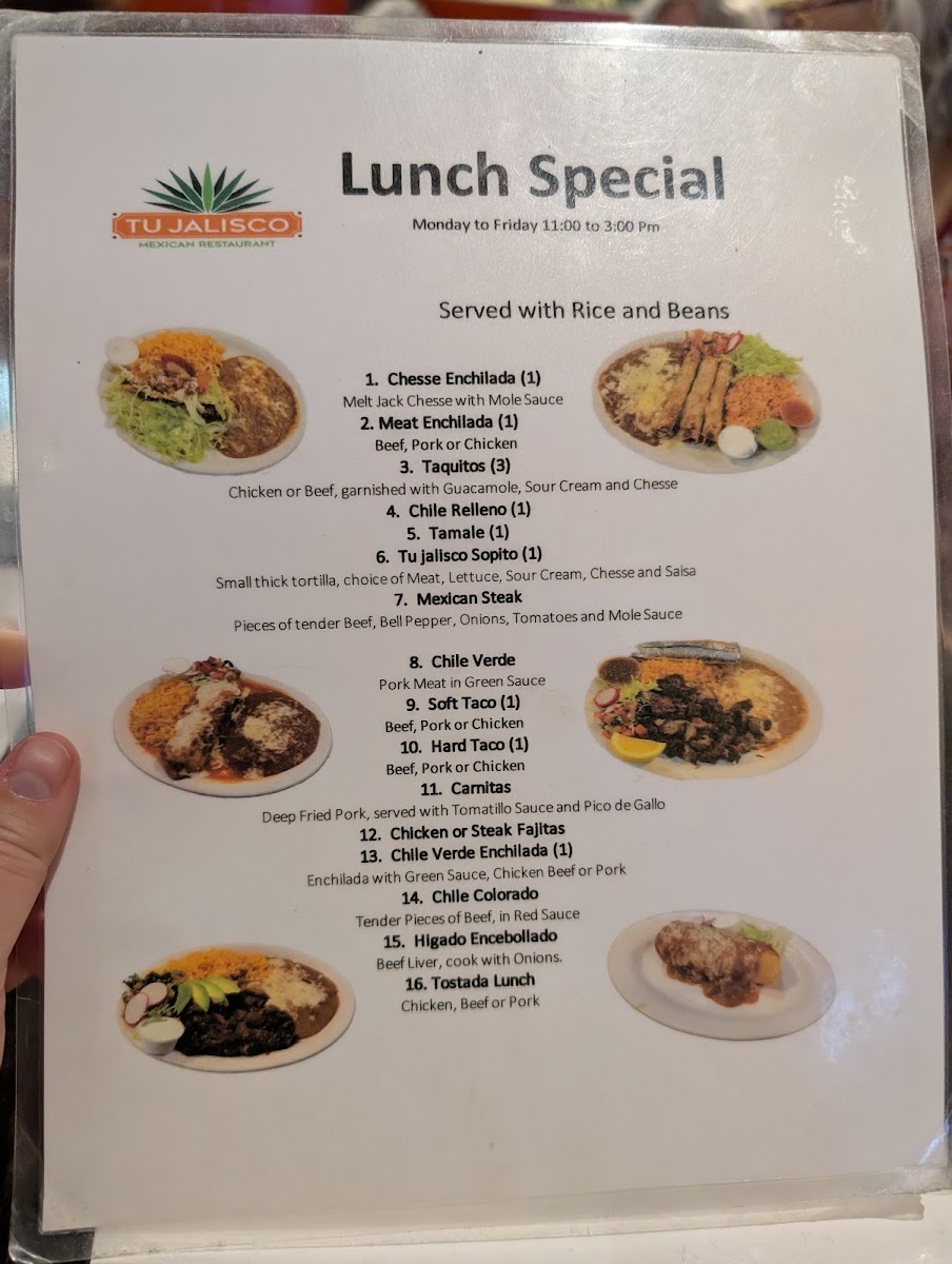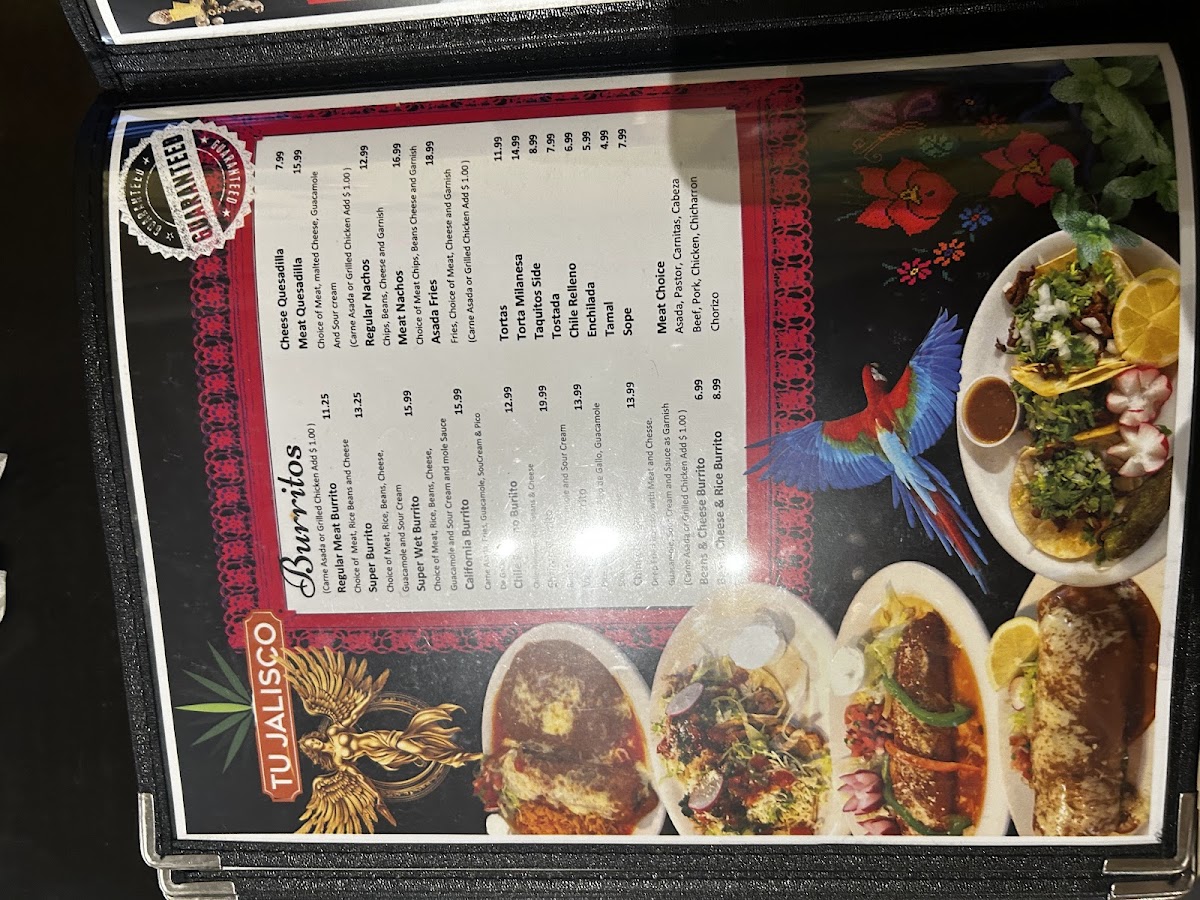 Flour tortilla with choice of meat with beans, rice, sour cream, jack cheese, guacamole and mole sauce.