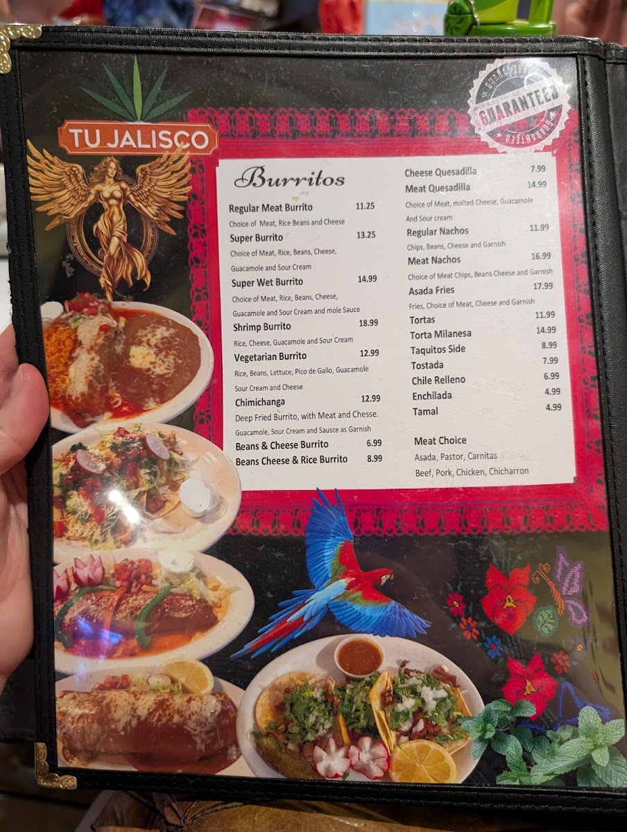 Flour tortilla with choice of meat with beans, rice, sour cream, jack cheese and guacamole.
